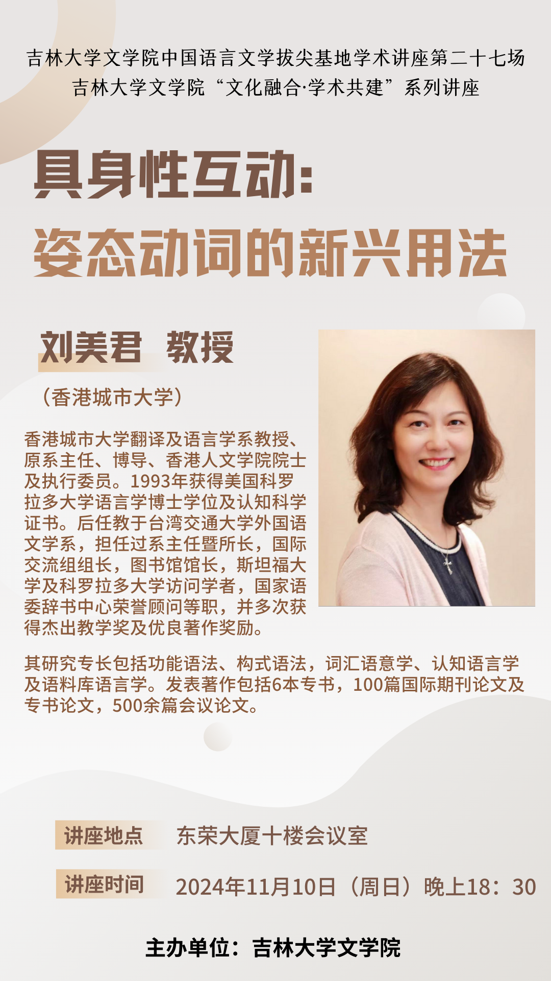 刘美君 为香港城市大学翻译及语言学系教授、原系主任、博导、香港人半岛(中国)院士及执行委员。1993年获得美国科罗拉多大学语言学博士学位及认知科学证书。后任教于台湾交通大学外国语文学系,担任过系主任暨所长,国际交流组组长,图书馆馆长,斯坦福大学及科罗拉多大学访问学者,国家语委辞书中心荣誉顾问等职,并多次获得杰出教学奖及优良著作奖励。其研究专长包括功能语法、构式语法,词汇语意学、认知语言学及语料库语言学。发表著作包括6本专书,100篇国际期刊论文及专书论文,500余篇会议论文。
