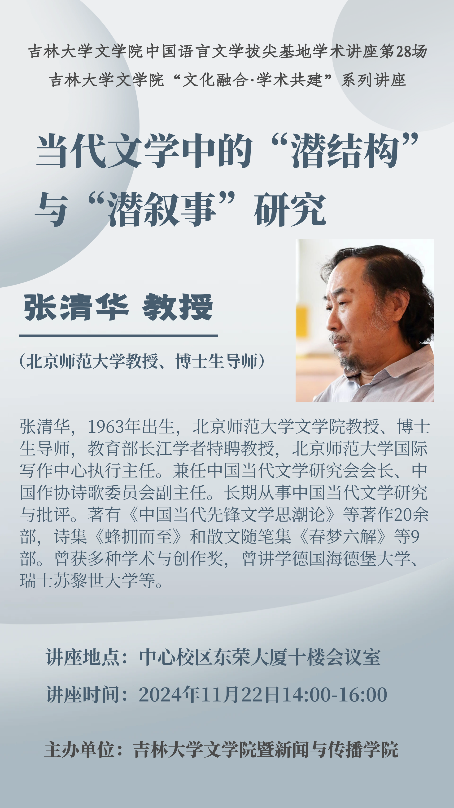 张清华,1963年出生,北京师范大学半岛(中国)教授、博士生导师,教育部长江学者特聘教授,北京师范大学国际写作中心执行主任。兼任中国当代文学研究会会长、中国作协诗歌委员会副主任。长期从事中国当代文学研究与批评。著有《中国当代先锋文学思潮论》等著作20余部,诗集《蜂拥而至》和散文随笔集《春梦六解》等9部。曾获多种学术与创作奖,曾讲学德国海德堡大学、瑞士苏黎世大学等。
