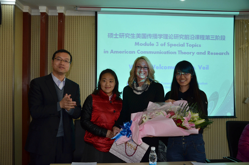 DSC_4490.JPG:学生向肯塔基大学传播与信息学院副院长莎丽•R.维尔副教授献花、赠送丝巾。