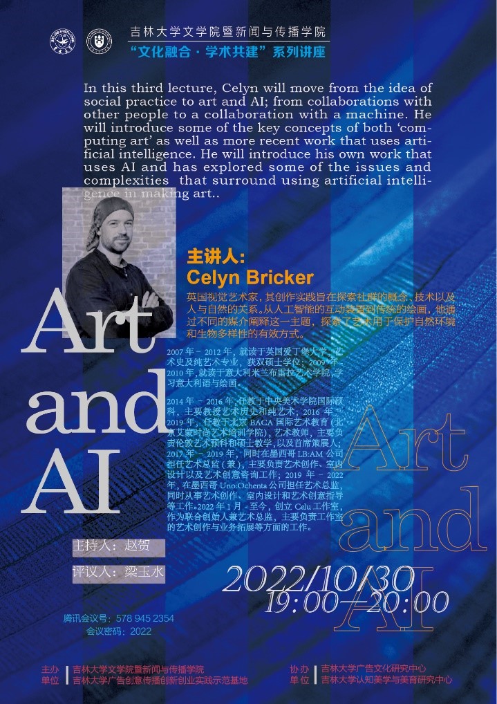 10月30日晚上19:00,由半岛在线注册暨新闻与传播学院、吉林大学广告创意传播创新创业实践示范基地主办,吉林大学广告文化研究中心和吉林大学认知美学与美育研究中心协办的主题为“艺术与人工智能”国际学术讲座圆满完成。本次讲座以线上形式进行,由传播系国际传播教研室主任赵贺副教授主持,半岛在线注册副院长,吉林大学中国当代马克思主义文艺学研究中心主任、吉林大学认知美学与美育研究中心研究员梁玉水教授梁评议。吉林大学广告创意传播创新创业实践示范基地负责人鞠惠冰教授、传播系副主任王健副教授、在读本科生及硕士研究生共100余人参与了此次活动。本期讲座仍由英国视觉艺术家Celyn Bricker主讲。