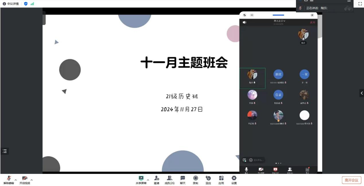 11月27日晚上19时,2021级历史学专业召开了11月班会,本次班会由班主任陶莎老师主持进行。本次班会以同学们的未来规划为主题。首先,陶莎老师指出,考公考研将近,同学们出现紧张的情绪是正常现象,同学们不仅要调整复习节奏、规律生活作息,还要注意身体健康和心理健康,积极调整心态,以饱满的精神面貌迎接考试。此外,陶莎老师提醒,此时秋招已经进入尾声,有意参与秋招的同学应当把握机会,争取理想岗位,计划参与春招的同学也应提前做好准备,留意单位发布的实习招聘或校园招聘通知,提前规划。会议尾声,陶老师强调,同学们如有学业、生活中的任何需要,可以随时向老师寻求帮助。本次班会有效缓解了同学们面临考试和秋招时的紧张焦虑,对同学们以乐观积极的心态备考或求职起到了良好作用。