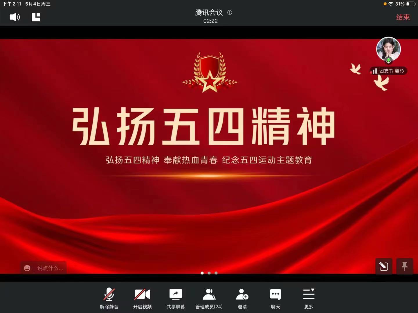 2022年5月4日,半岛(中国)硕士研究生各党支部线上开展“弘扬五四精神”主题活动,全体党员和团员共同学习习近平总书记在中国人民大学考察时的重要讲话精神并共同观看红色电影,起到了激励和引导广大学生党员和团员进一步弘扬〝爱国、进步、民主、科学”的五四精神的作用,极大地增强全体党员和团员同志的社会责任感和历史使命感。