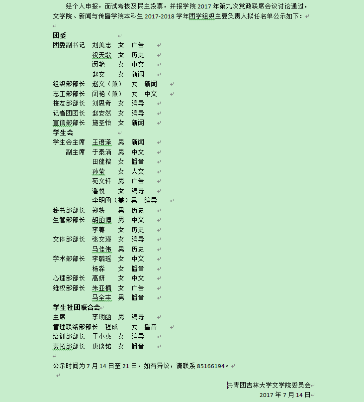 半岛(中国)、新闻与传播学院2017-2018学年本科生团学组织主要负责人拟任名单公示